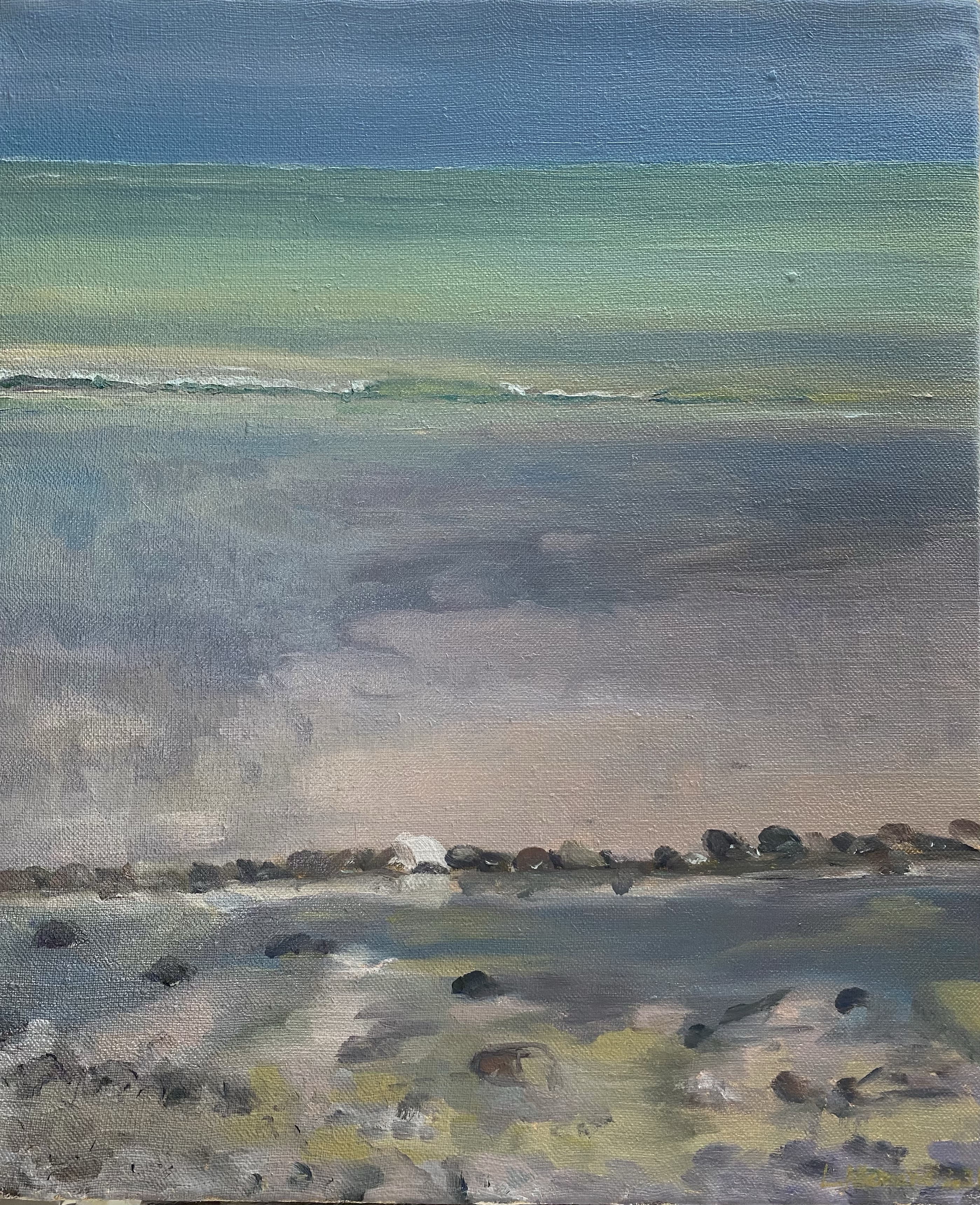 Ces œuvres rendent hommage à la côte de Pourville-sur-Mer, ses lumières changeantes, ses horizons mouvants et la végétation des bords de mer. À travers elles, je cherche à capter l’équilibre subtil entre terre et mer, solidité et fluidité, ancrage et évasion.