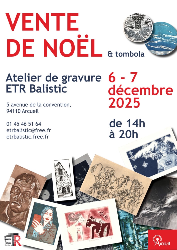 Mes gravures seront présentées lors de la vente de Noël de l’atelier ETR Balistic les 6 et 7 décembre 2025 à Arcueil. Une occasion idéale pour offrir des œuvres originales et découvrir les créations des artistes de l’atelier.