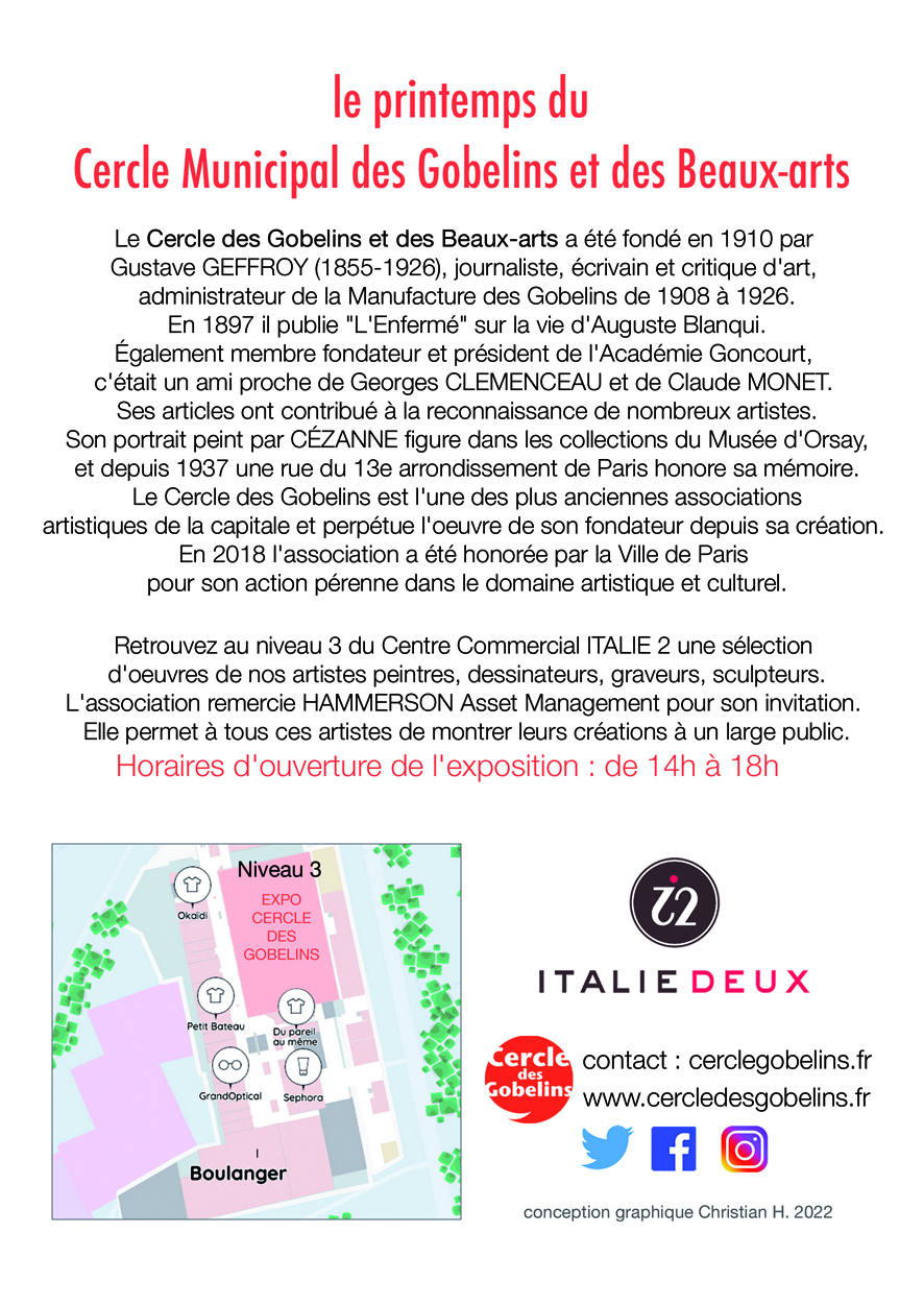 C’est avec grand plaisir que je participe à l’exposition collective du Printemps du Cercle des Gobelins qui se tiendra du 16 mai au 2 juin 2022, du lundi au samedi (14h-18h).